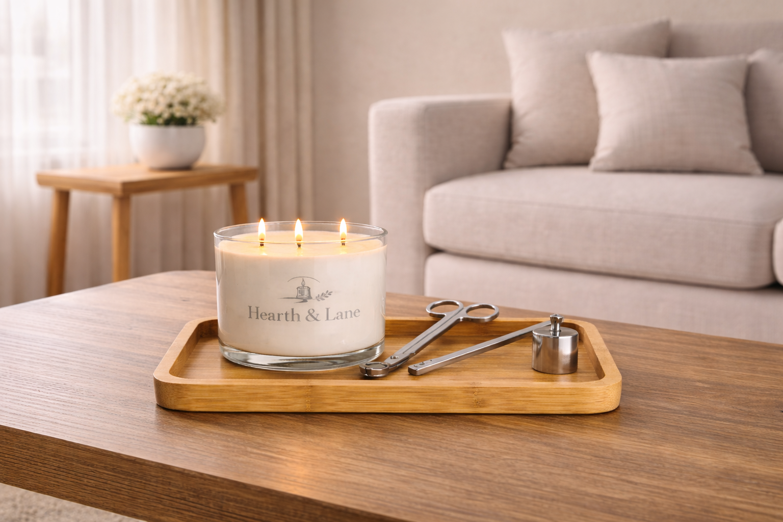 A refined candle care gift set with a hand-poured candle, minimalist tray, wick trimmer, and snuffer—designed for clean burns and timeless style.